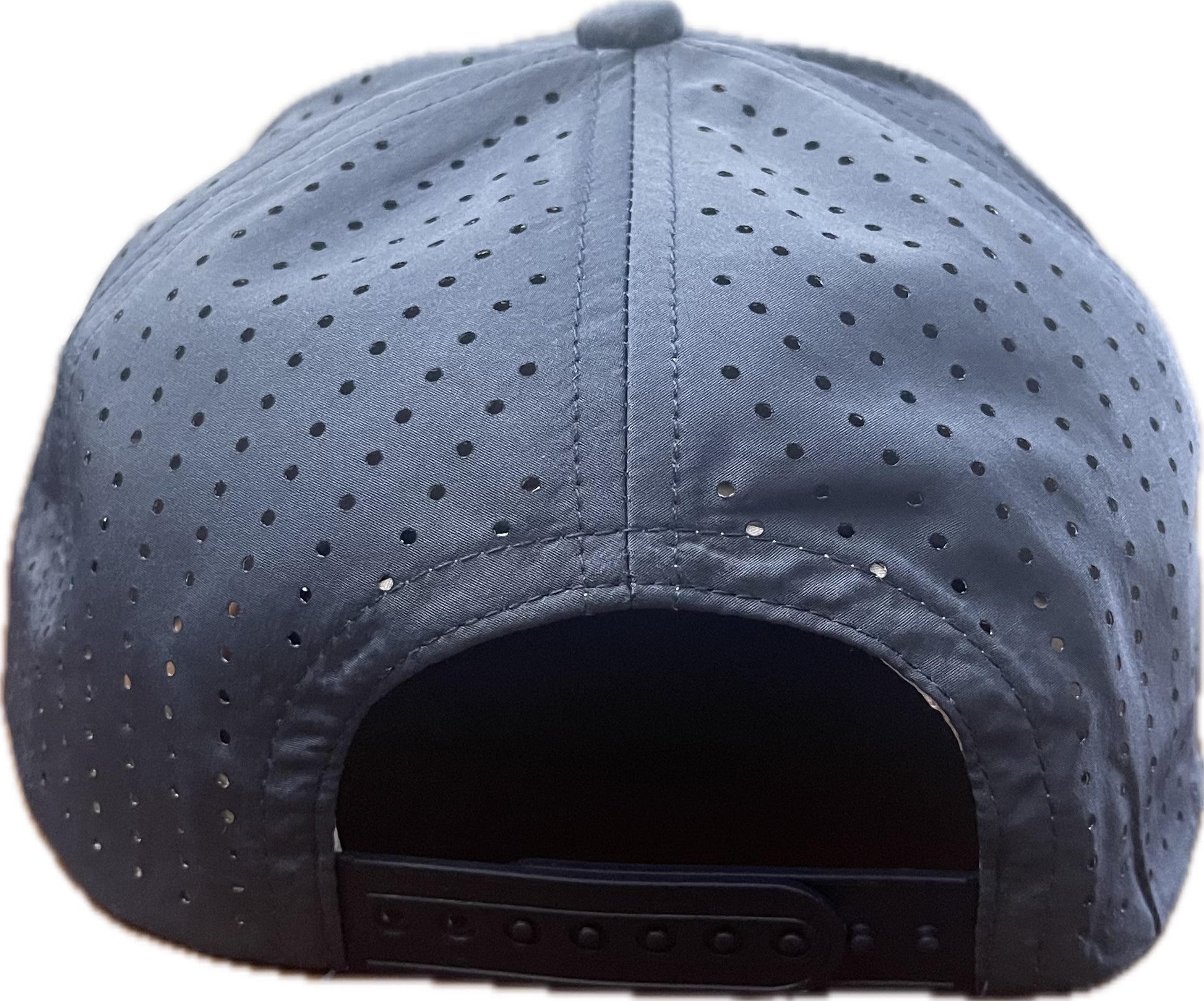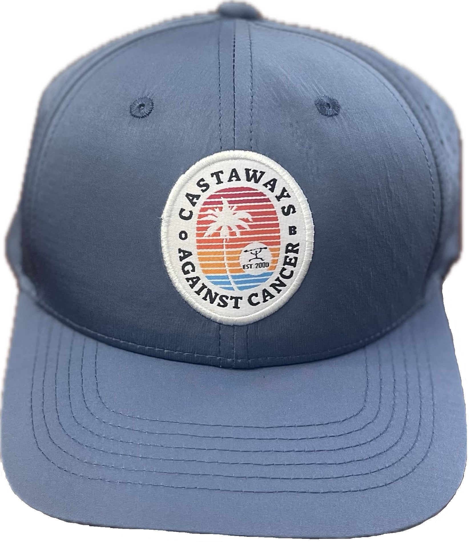 Blue performance cap with ventilated mesh holes back and woven sublimated custom Castaways Against Cancer logo patch.
